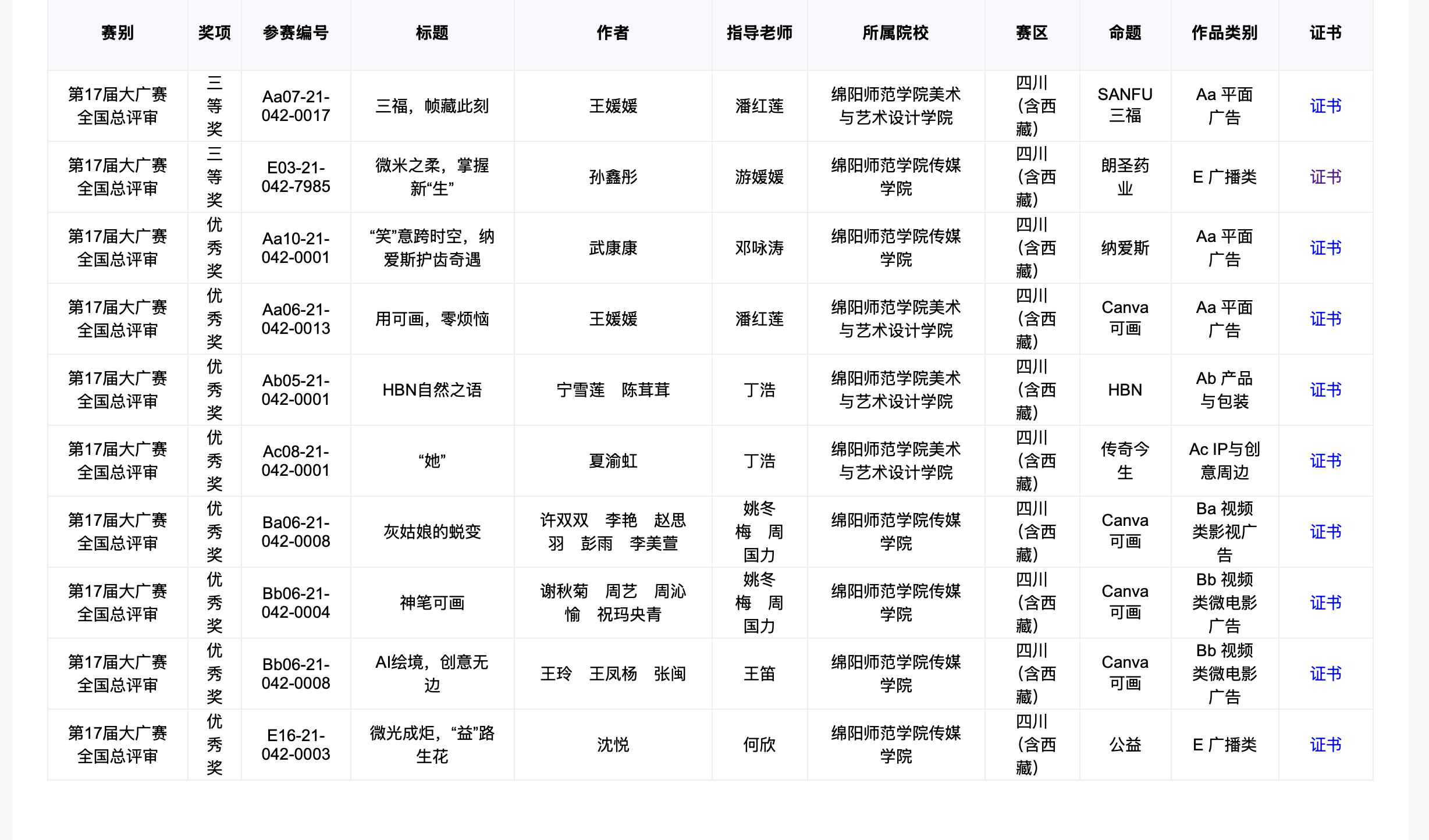 近日,第十四届全国大学生广告艺术大赛(简称“大广赛”)评审结果陆续揭晓。我校传媒学院学子凭借出色的创意与扎实的专业能力,在比赛中表现卓越,捷报频传,荣获国家级三等奖1项、国家级优秀奖5项,省级一等奖8项、省级二等奖24项、省级三等奖38项及省级优秀奖多项,获奖数量与质量均创历史新高,实现了在该项顶级赛事中的全新突破。