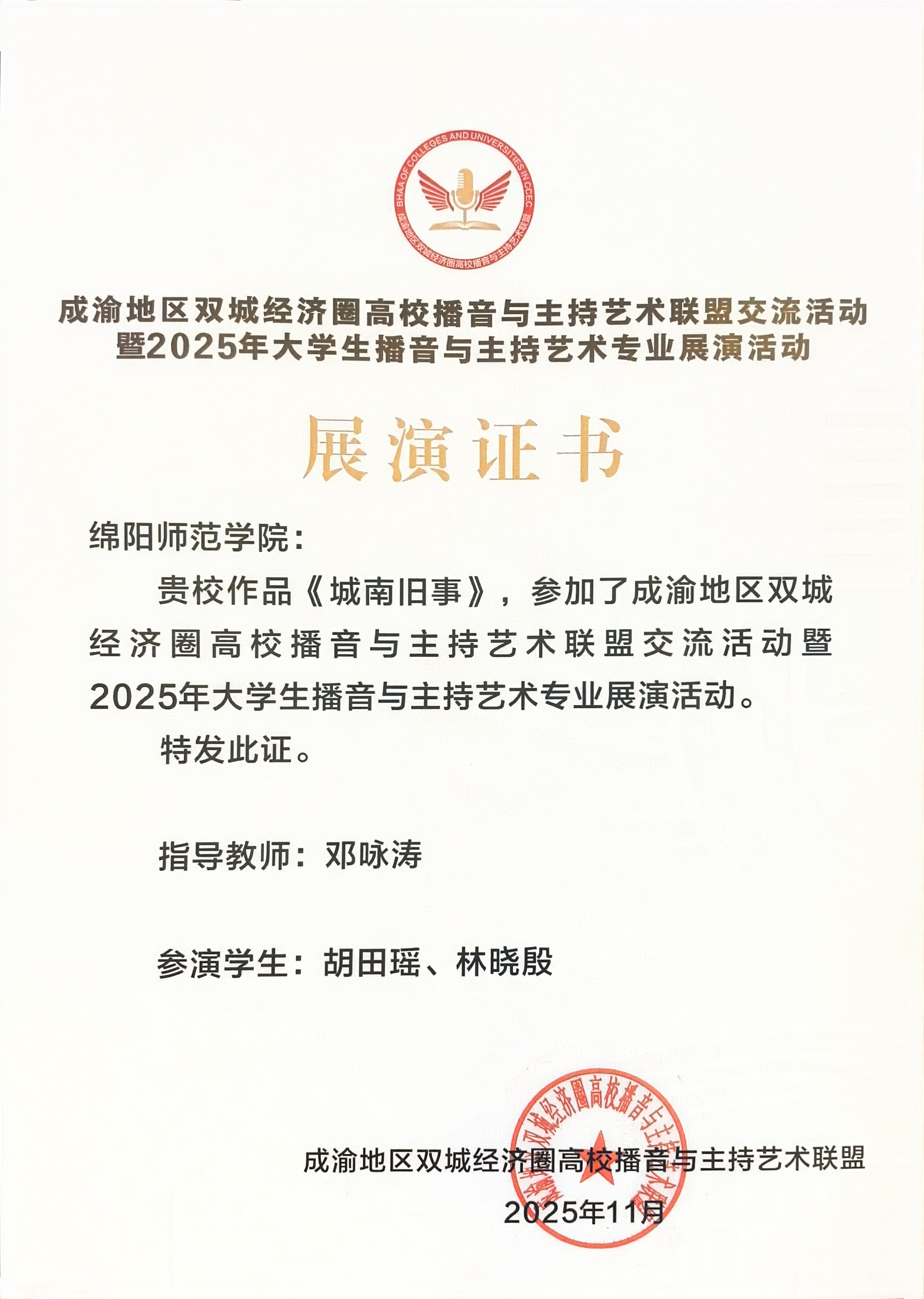 作为成渝区域播音主持教育交流的重要成果,本次展演的入围与精彩呈现,标志着学校播音主持专业的教学实力获得区域其他高校的认可,也为学院后续深化专业建设、拓展校际交流奠定了基础。
