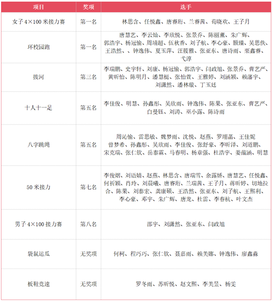 放眼团体项目,传院学子的协作精神闪耀赛场:女子4×100米接力赛中,林思含率女子接力队以稳定发挥强势夺金;“环校园跑”项目传院代表队默契配合,合力拿下第一名;李瑞鹏率学院拔河队力聚一绳斩获季军;十人十一足队伍和八字跳绳项目均取得第五名的好成绩;田径组50米接力获得第七名;邵宇率男子4×100队取得第八名;袋鼠运瓜队和板鞋竞速队虽未获奖,但学子们彼此扶持的身影生动诠释了永不言弃的拼搏精神。