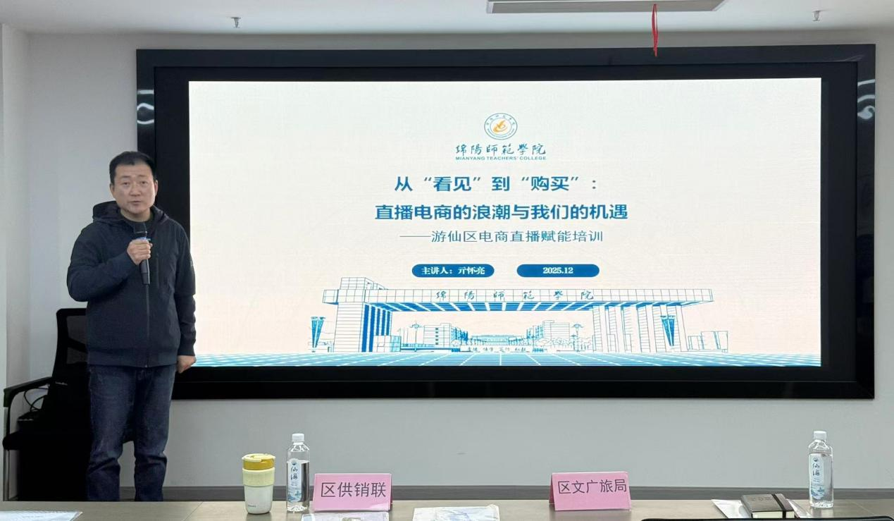 2025年12月22日,传媒学院教师亓怀亮应绵阳市游仙区商务局邀请,在川北数字场景孵化应用基地为当地企业、乡镇及村级骨干人员开展直播电商专题培训,助力区域电商人才培养与乡村振兴。