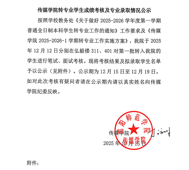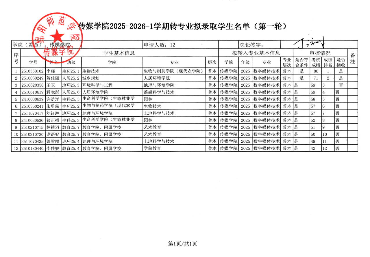 传媒学院关于公布2025-2026-1学期转专业考核结果的通知