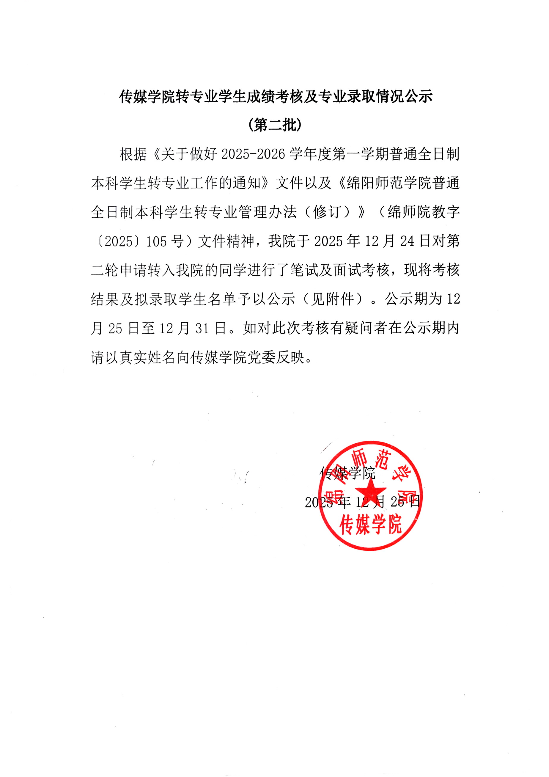 传媒学院转专业学生成绩考核及专业录取情况公示(第二批)